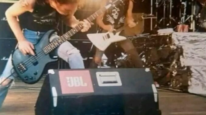 There are moments in rock history when a single image captures everything words struggle to explain. The blur of flying hair, the clenched fists gripping guitar necks, the stage lights exploding like a second sun behind the band—this is one of those moments. The photograph freezes a young metal band mid-eruption, but the sound, the sweat, and the sheer electricity spill far beyond the frame. This is not nostalgia yet. This is metal in its raw, feral becoming.